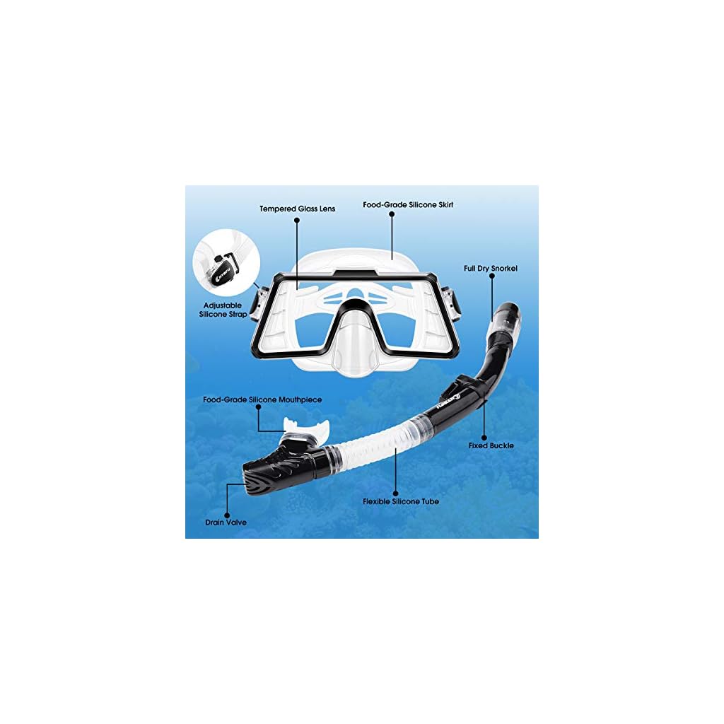 ANTI-FOG GEHÄRTETES GLAS TAUCHERBRILLE: Die Schnorchel-Tauchmaske verfügt über eine Hartglaslinse mit 180° Panoramablick zum Schnorcheln, Schwimmen und Tauchen. Taucherbrille mit ergonomischem Design für maximale Passform mit unterschiedlichen Gesichtsformen, angenehmerem Tragekomfort und stärkerer Versiegelung; Der Rock besteht aus weichem, flüssigem, transparentem Silikon in Lebensmittelqualität und bietet Ultra-Sichtbarkeit. Sie werden ein kristallklares Unterwassererlebnis haben!