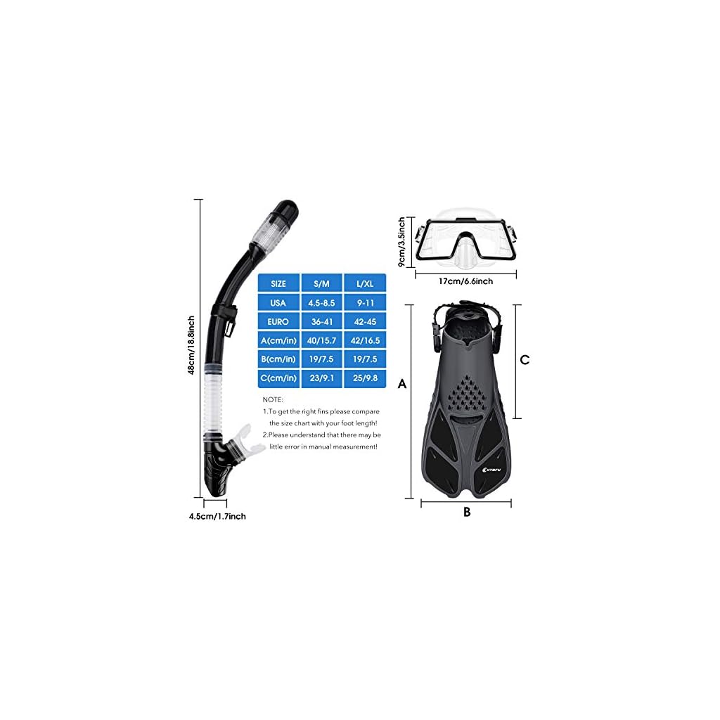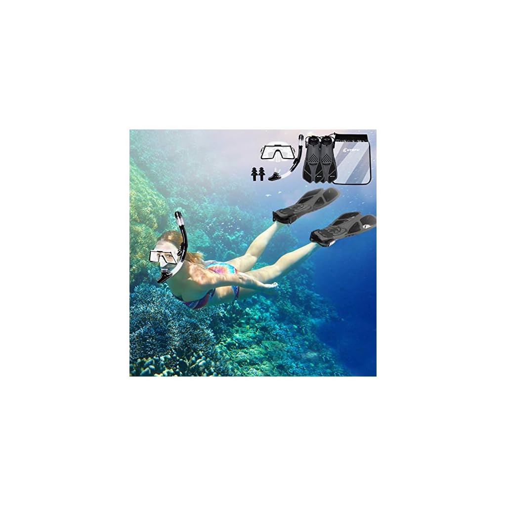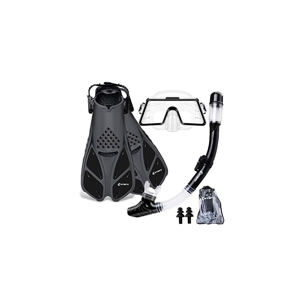 SCHNORCHELSET ERWACHSENE MIT FLOSSEN: Ein tauchausrüstung komplett set Tauchset mit voller Ausrüstung nur für Sie! Das CHYBFU Schnorchel-Set enthält verstellbare Schwimmflossen, eine Tauchmaske aus gehärtetem Glas, einen Schnorchel mit trockenem Oberteil, eine Reiseausrüstungstasche und 1 Paar weiche Silikon-Ohrstöpsel. Es ist Ihr ultimativer Reisebegleiter und eignet sich zum Schnorcheln, Schwimmen, Body-Surfen, Boogie-Boards usw!