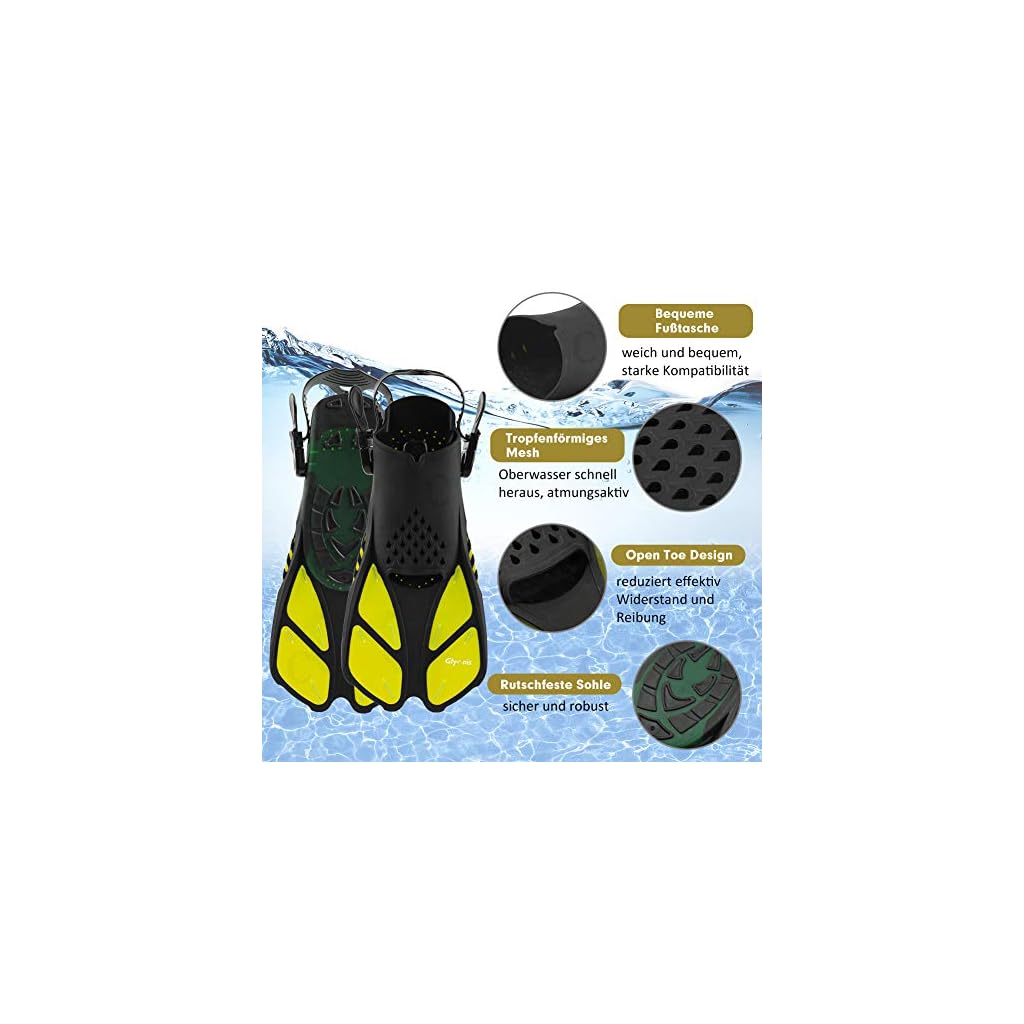 Glymnis Schnorchelflossen Verstellbare Flossen Schwimmflossen für Erwachsene und Kinder Kurze Tauchflossen zum Tauchen Schwimmen Schnorcheln (Schwarz/Gelb, S/M)