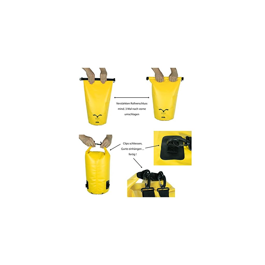 KOMPLETT-SET mit TASCHE & ROLLVERSCHLUSS: Den praktischen Roll-Top-Verschluss einfach dreimal umklappen, dann den Clip-Verschluss schließen – schon ist der Drybag dicht und verfügt gleichzeitig über einen Tragegriff. Unsere Clips verfügen über extra dicke Halteringe sowie selbst arretierende Metallbügel und sind auch einhändig leicht einzuhängen. Zum Verstauen liefern wir das Ganze sogar mit gratis Aufbewahrungstasche mit Kordelzug.