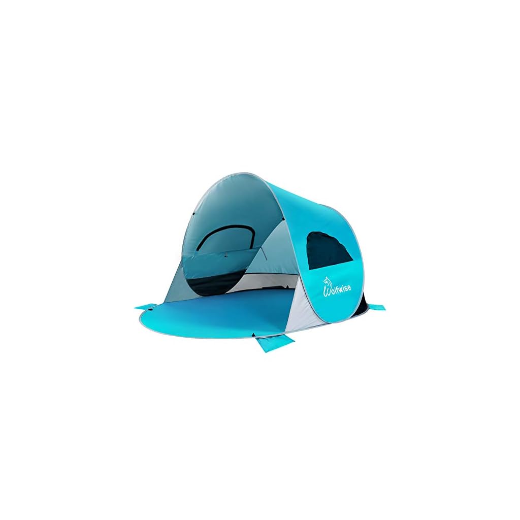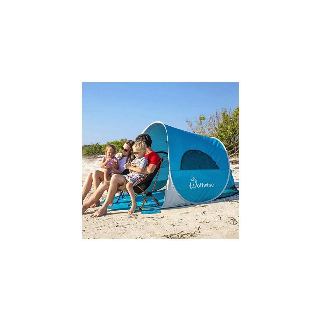 WolfWise Strandmuschel Pop-Up Zelt mit UV-Schutz 50+, 3-4 Personen Strandzelt, Sonnenschutz & Windschutz Tragbar Wurfzelt Baby Kinder Sonnenzelt Kleines Packmaß für Familie Camping Garten Strand Blau